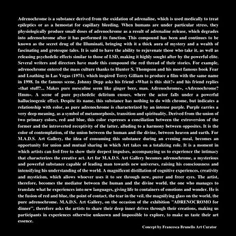 Adrenochrome's colour is an instense purple. Purple carries a very deep meaning, as a symbol of metamorphosis, transition and spirituality.